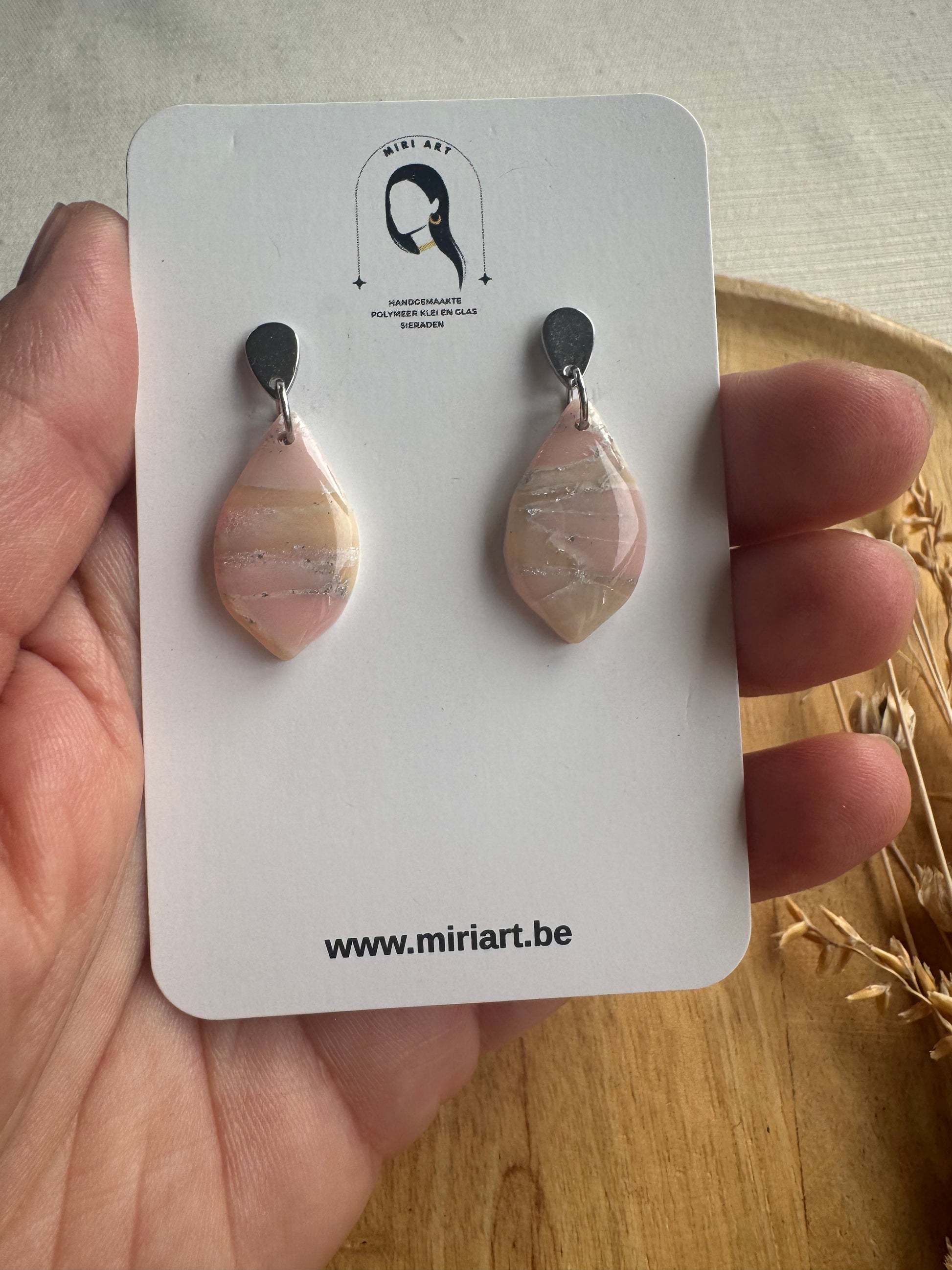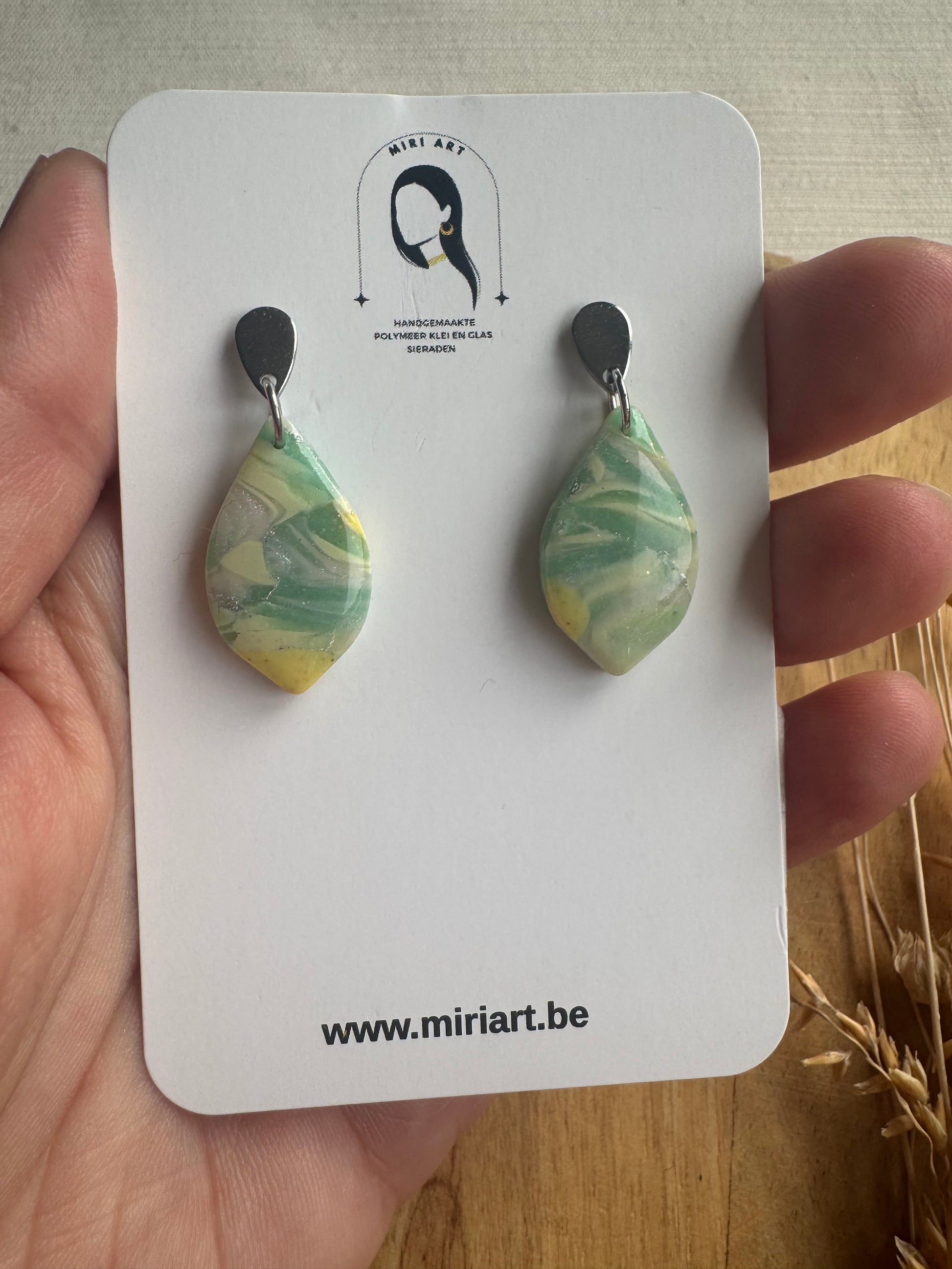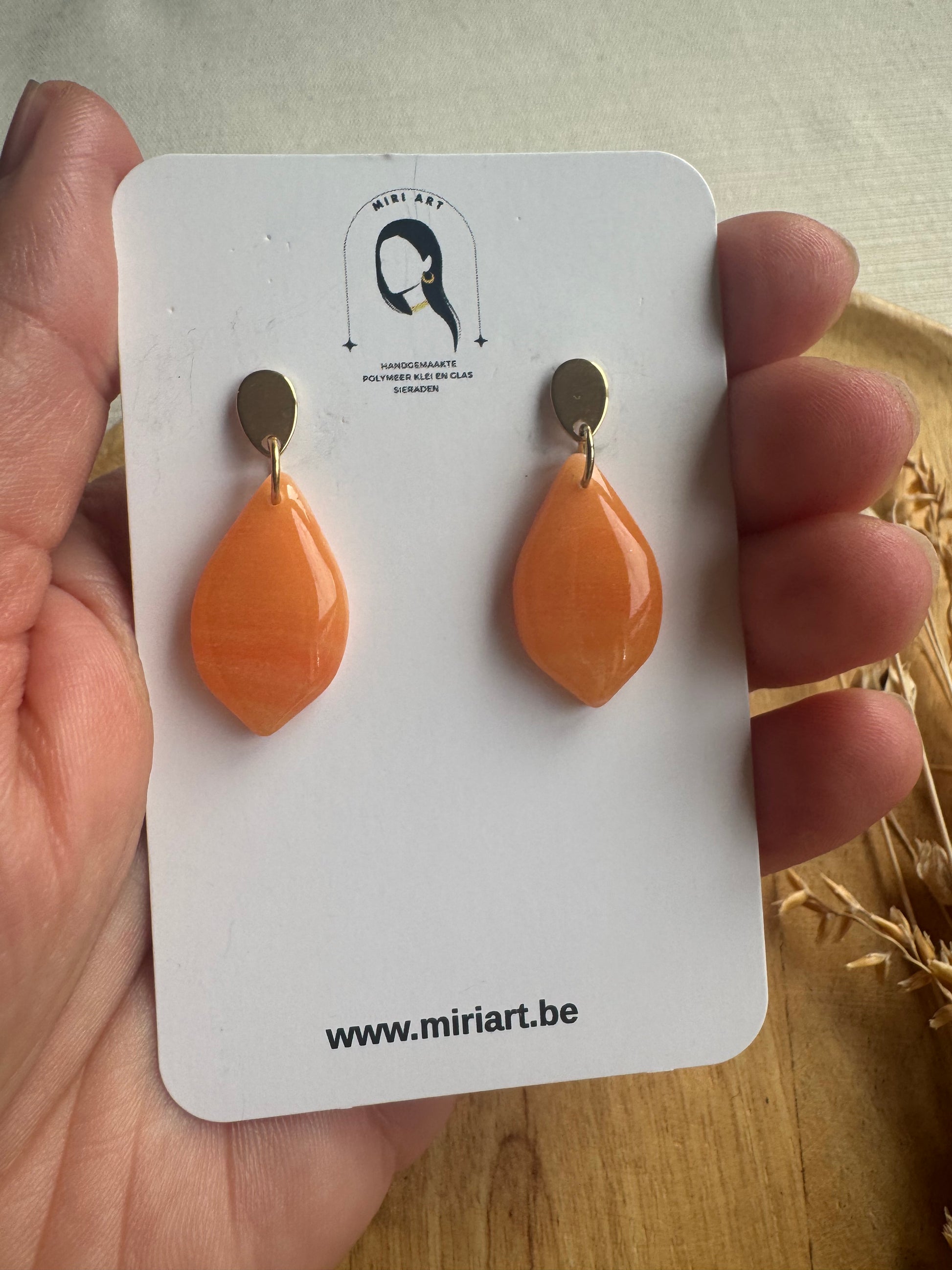 De oorbellen zijn met veel liefde van polymeer klei door mezelf gemaakt , ze zijn erg licht en zeer comfortabel om te dragen. Eerst wordt de klei gemengd, de gewenste vorm gesneden /geboetseerd en indien nodig verwerkt met een patroon. Vervolgens gaan de stukken klei de oven in, daarna wordt het geschuurd en gepolijst . Nadien krijgen ze een vernislaag of worden ze afgewerkt met epoxyhars, geboord en voor u gemonteerd tot de afgewerkte oorbellen. Ik gebruik voor alle oorstukken enkel anti allergisch roestvrijstaal, soms worden gebruikt ook hangers van nikkel vrije messing. Elke paar oorbellen wordt geleverd met 2 paren slotjes ( één van roestvrijstaal en de andere van anti allergische silicone )