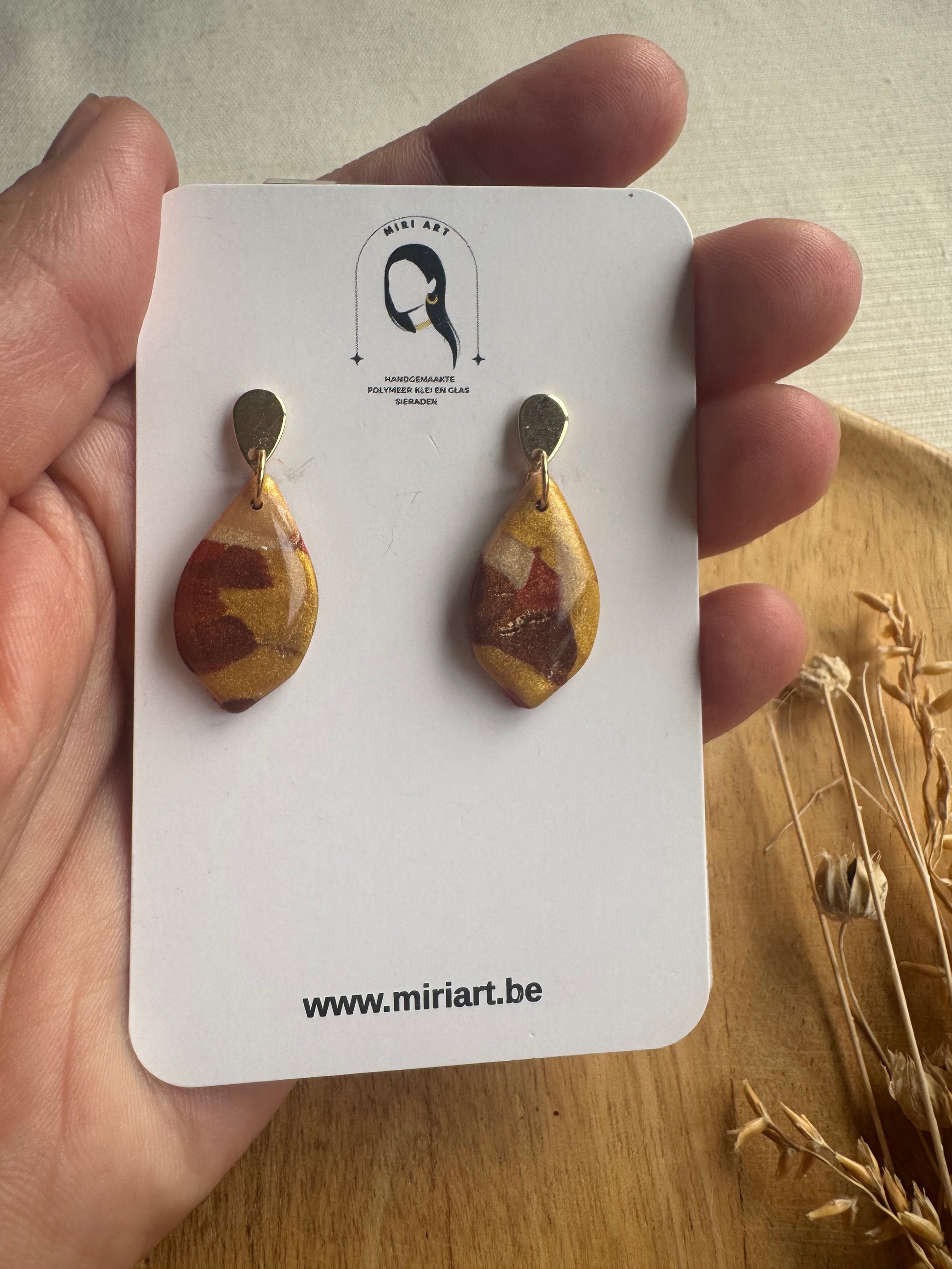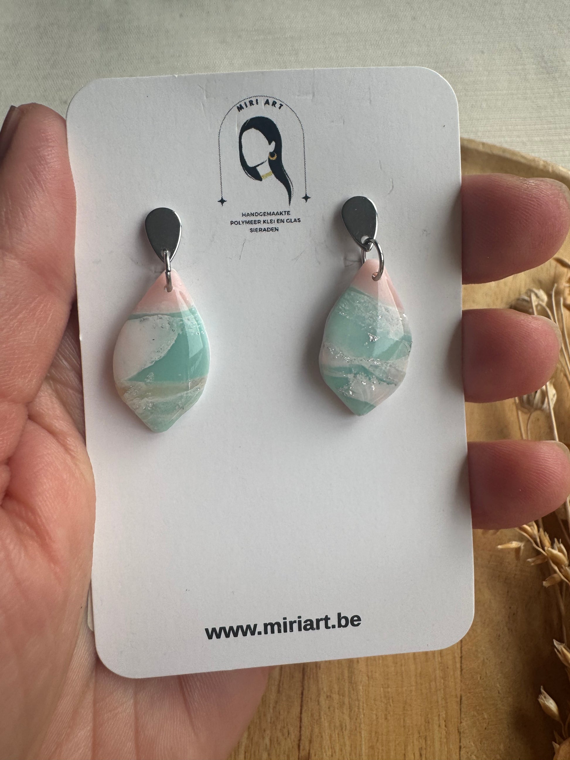 Handgemaakte oorbellen van polymeer klei , laagje epoxi hars en roestvrijstaal .