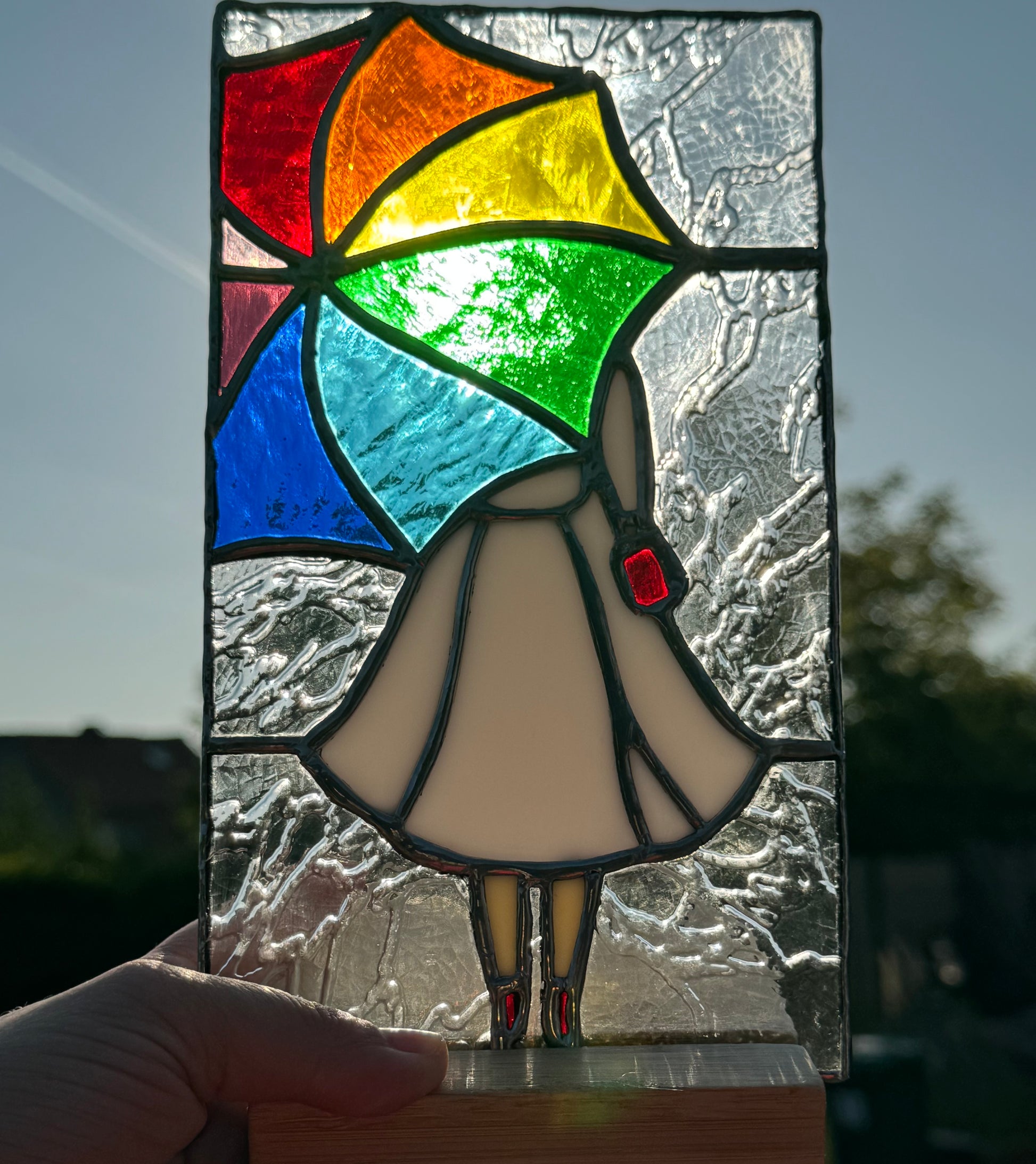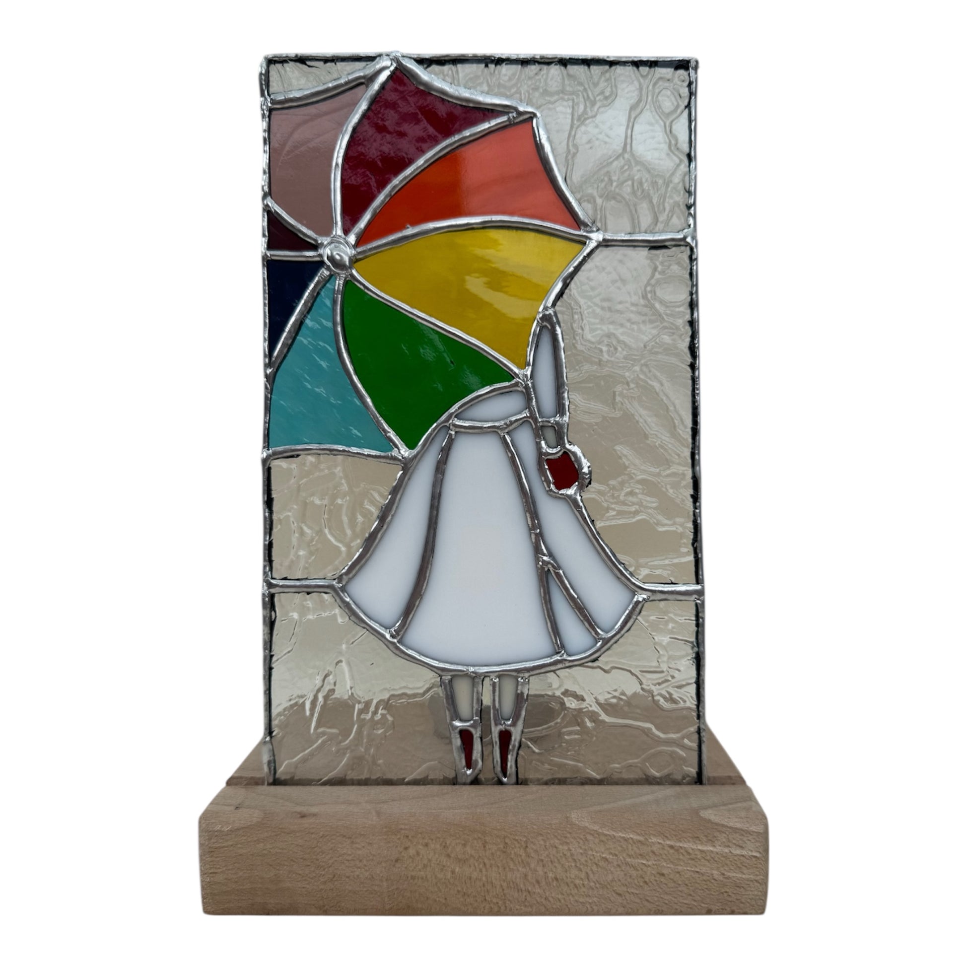 - Materiaal: glas (Tiffany-techniek) en hout